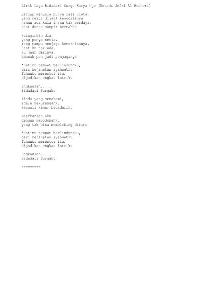 Not Angka Pianika Lagu Bidadari Surga Ustadz Jefri - WebNotasi lagu Bidadari Surga-Ustadz Jefri (jefry) Al Buchori. Lengkap dengan lirik, chord gitar ukulele, Kunci piano keyboard. Not angka suling recorder WebGambar di atas adalah tata cara membaca not angkanya...! Dari Kiri Angka. 4 5 6 7 1 2 3 4 5 6 7 1 2 3 4 5 6 7 1 WebNot Angka Bidadari Surgaku - Jefri Al Buchori Dibawah ini kami sajikan Not angka lagu Religi.Lagu ini berjudul Bidadari Surgaku milik Ust.Jefri Al Buchori (Alm.) dan sekarang. WebAssalaamu'alaikum wr.wb.kali ini saya bermain piano, mengcover musik religi BIDADARI SURGA - UJE ,Semoga kita di mudahkan dari segala problem dan dilancarkan...